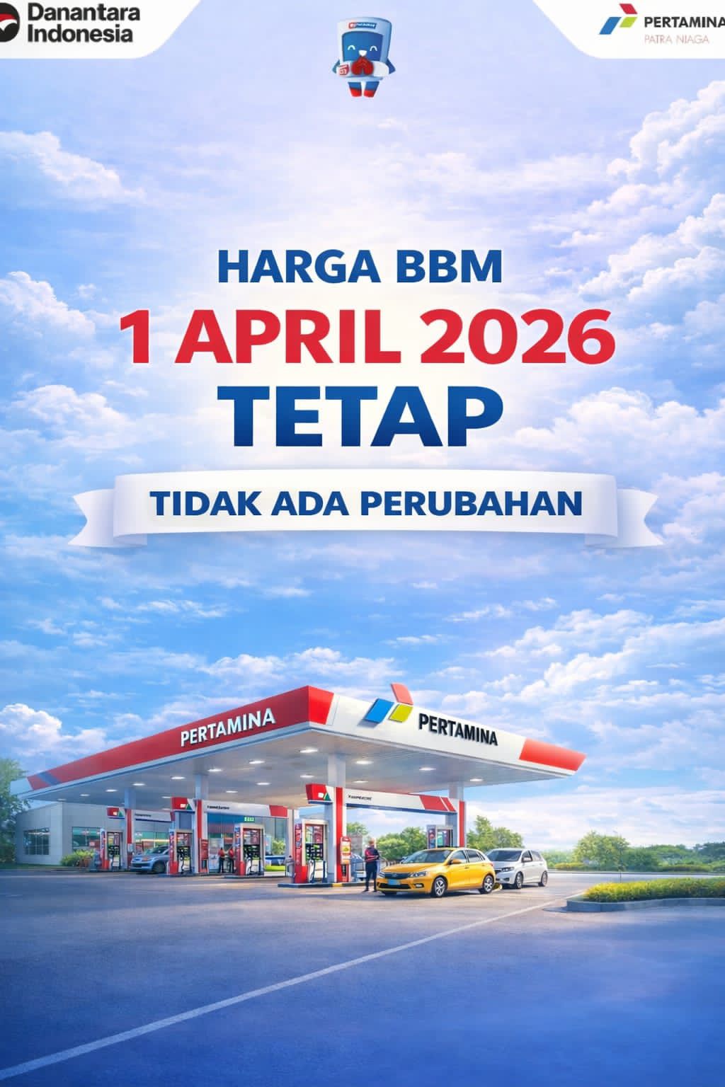 Pemerintah melalui Pertamina Patra Niaga menyampaikan bahwa harga Bahan Bakar Minyak (BBM) per 1 April 2026 tetap dan tidak mengalami perubahan. Kondisi ini diharapkan dapat menjaga stabilitas harga serta memberikan kepastian bagi masyarakat dalam memenuhi kebutuhan energi sehari-hari.