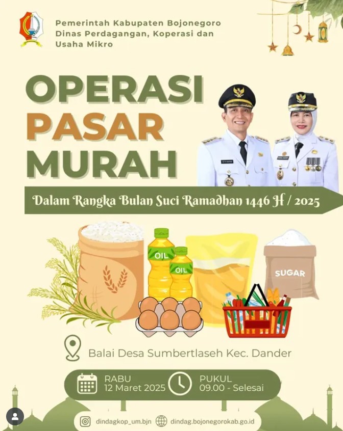 Dinas Perdagangan, Koperasi dan Usaha Mikro Kab. Bojonegro kembali hadir dengan Operasi Pasar Murah dalam rangka Bulan Suci Ramadhan 1446 H akan di selenggarakan di Balai Desa Sumbertlaseh Kecamatan Dander pada Hari Rabu, 12 Maret 2025 pukul 09.00 sampai selesai.