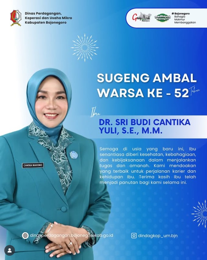 Sugeng Ambal Warsa Ibu @cantikawahono Ketua Dekranasda Kabupaten BojonegoroSelamat ulang tahun ke-52Semoga senantiasa diberikan kesehatan, panjang umur, kelancaran, keberkahan, dan kebahagiaan, serta kebijaksanaan dalam...